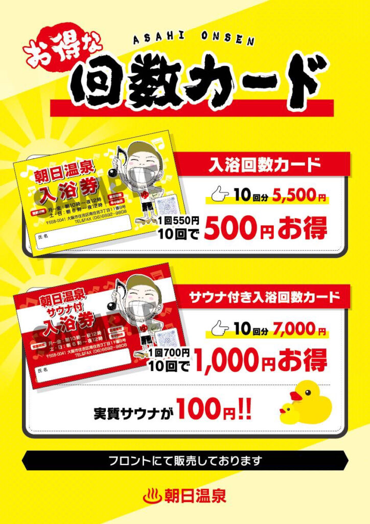 回数券・スタンプカードについて|朝日温泉 お知らせ 2025年11月3日2025年12月23日 目次お得な回数券 スタンプカード 来店ごとにポイントが貯まる! 20ポイント → 入浴半額 or サウナ無料(1回)50ポイント → 入浴無料(1回) 🗓 有効期限:最後の利用日から1年間📍 カード忘れ・紛失・合算・他サービス併用は不可