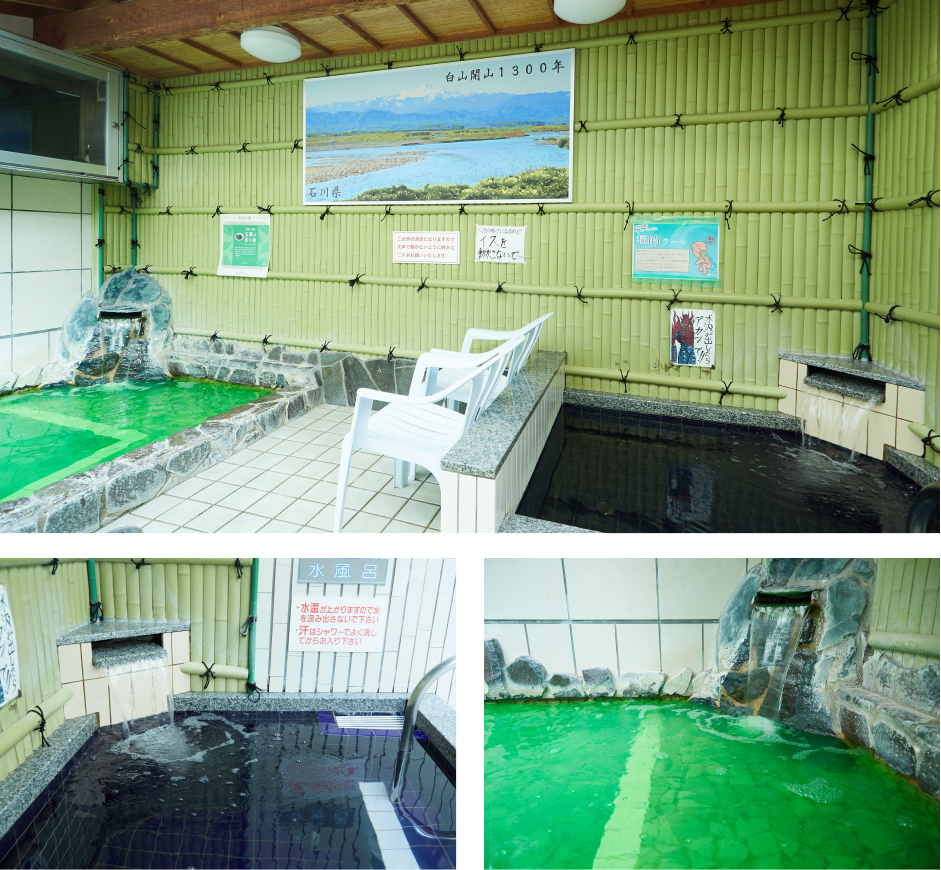 日本庭園風の露天エリアには、水風呂と日替わり風呂がスタンバイ。